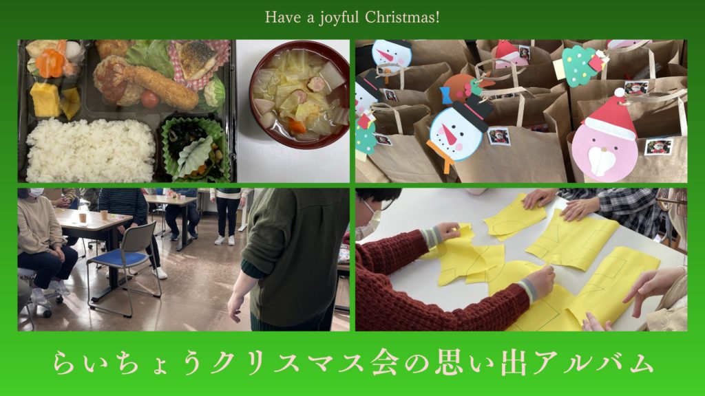 2025年12月19日(金)らいちょう蜷川、らいちょう熊野の各事業所にてクリスマス会を開催しました。ゲームでは「私は誰でしょう(連想ゲーム)」や「破ってパズル復元」や「イントロクイズ」や「サザエさんキャラクター当てはめクイズ」「ききじゃがりこ」「ビンゴ」ほかたくさんのゲームを楽しみました。